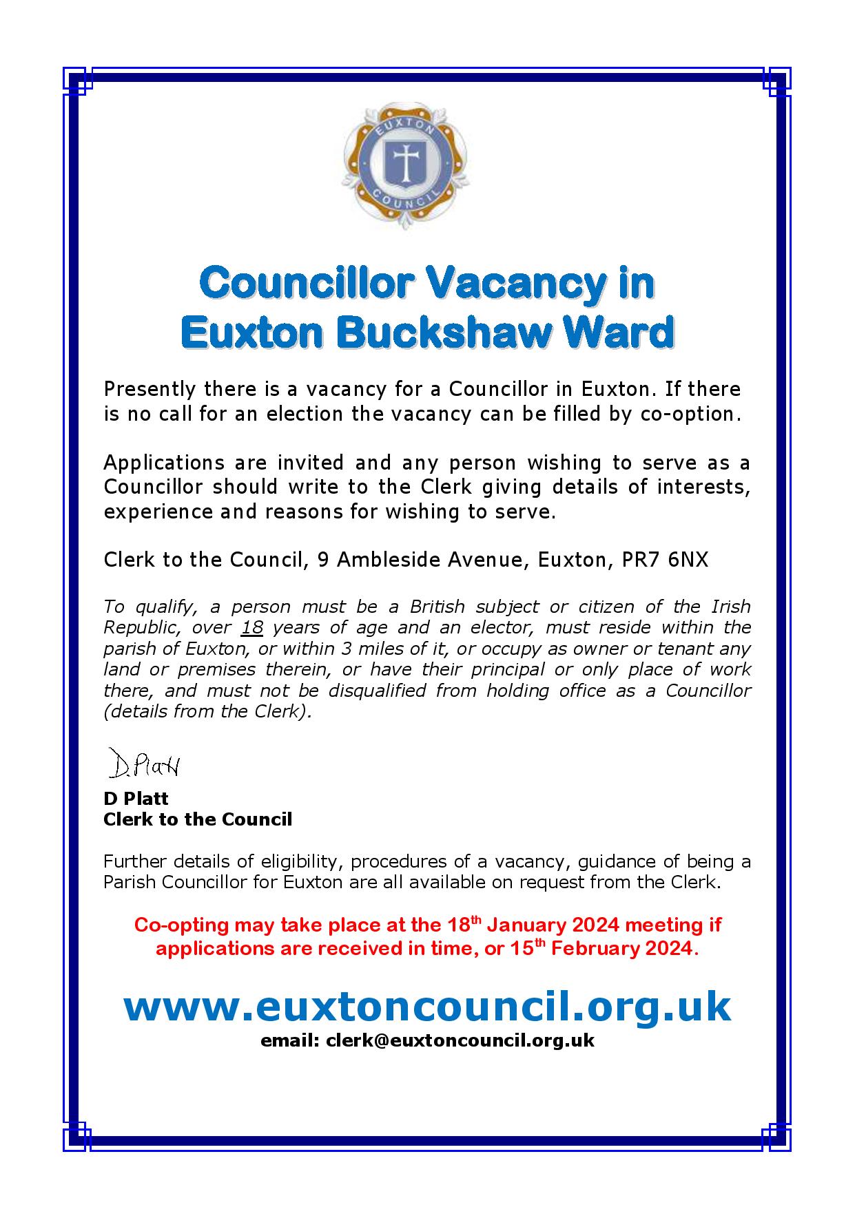 There is a vacancy for a Councillor - please see the notice and the attached document, if no election is called.